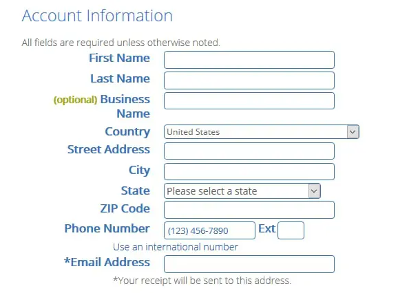 After establishing a domain name, you can now create a BlueHost account for the hosting package. At this point, you are required to fill out your personal information as shown below: