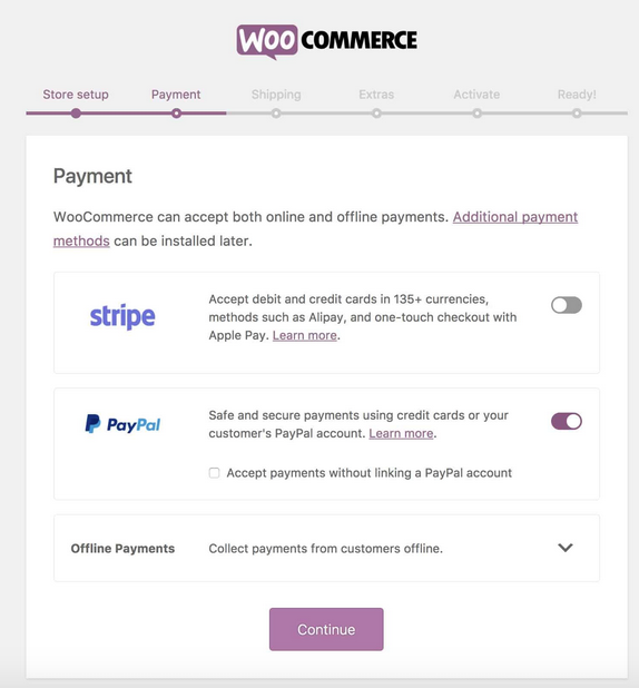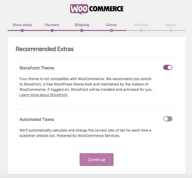 In addition, WooCommerce automatically calculates the taxes for you if you check the box. If you want to proceed to the next page, click on continue. At this point, you can activate the Jetpack plugin if you are looking to enhance your website.
