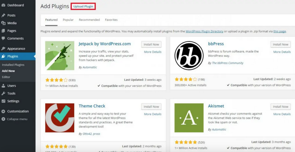 After clicking on the add new feature, select upload plugin to upload the plugin that you recently downloaded.