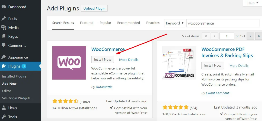 Once you are done, search for “WooCommerce” then click on “install now” followed by the activate button.