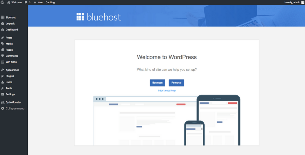 The next page displays your WordPress dashboard. You’ll see “Welcome to WordPress” display followed by a question that asks if you need help.