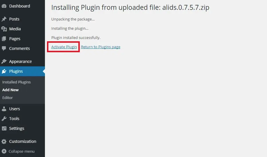 After uploading the AliDropship plugin, you’ll be redirected to the next page where you can activate it.