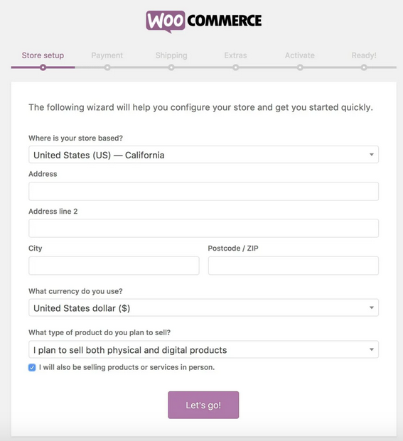 You’ll need to enter the address of your online store and preferred currency on the first page. Save for that, you are also supposed to fill in the type of products you plan on selling and whether or not you’ll be selling the goods in person. Make sure you uncheck the sell in person box and instead click the let’s go button.