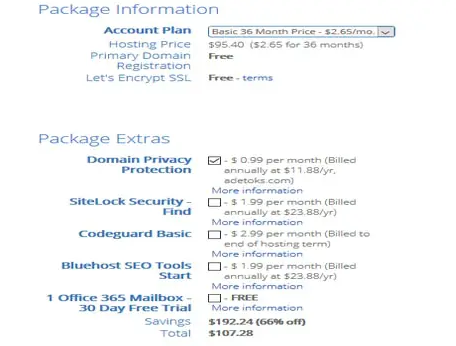 BlueHost offers an account plan that lets you choose a suitable one depending on your budget. You can opt for a 12, 36 or even 60-month one-time subscription. Avoid any unnecessary costs by looking out for the extra checked add-on boxes. The domain name privacy add-on is the only exception even though its not compulsory.