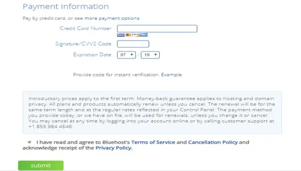 Once you are done, enter payment information and check the terms of service by the hosting company. In this case, BlueHost and click the submit button.
