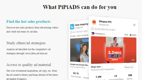 PiPiads gives its users access to quality ad materials that will help them run a successful eCommerce or dropshipping business. There’s a template inspiration for the ads, updated information about TikTok ads and PiPiads along with a number of market sales to help increase sales.